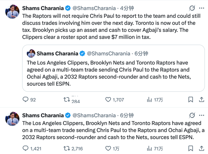 五大联赛直播-快船篮网猛龙交易!保罗被送到多伦多 不会报到+预计被裁掉或易主|克里斯·保罗|奢侈税|Shams|多伦多猛龙队|洛杉矶快船队_新浪体育_新浪新闻